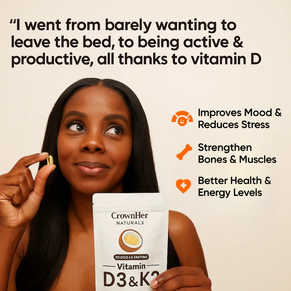 This isn't just a vitamin, it's a full-day energy + wellness transformation designed for melanin-rich skin. Black women need 10x more vitamin D than standard recommendations - and without K2, you're sending calcium to your arteries instead of your bones. That's why we created the first D3+K2 formula specifically dosed for melanin-rich women. Each softgel contains 10,000 IU D3 with 200mcg K2 (MK-7) - the exact combination that directs calcium where it belongs while addressing the 90% vitamin D production block caused by melanin. No more exhaustion. No more being dismissed. No more half-truths. 180 softgels per package. One capsule daily. The complete protection you were never offered.